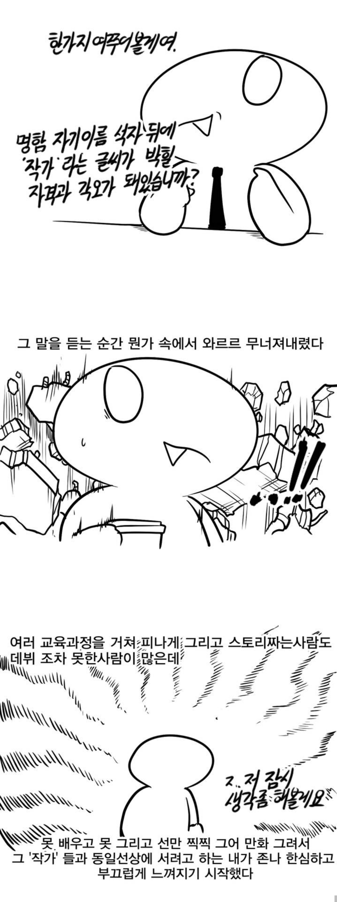 필자도 레바와 비슷한 고민을 했다. 많은 사람들이 필자를 '작가님'이라 불러 주고 있었다. 원래는 별 생각 없이, 글을 쓰는 입장이니 작가라 불리는가 보다 하면서 이런 호칭을 받아들였는데 이제는 마음이 너무 무거웠다. 누군가 필자를 '작가님'이라 부르며 페이스북 메시지를 보내왔다. 숨이 턱 막혔다. 낭떠러지에 서 있는 기분 같기도 하고. 조금 더 책임감 있게 글을 써야 하는가? 경솔한 마음가짐으로 글을 수 십 편을 올려 왔는데 이래도 되는 건가?