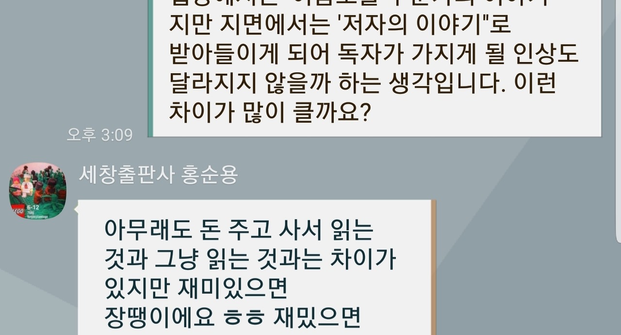 마음이 무겁고 고민이 해결되지 못한 상태다 보니 머리가 복잡했다. 코딩하는 공익 출간 방향을 정하기 위해 세창출판사 홍순용 편집자님과 카톡을 주고받을 때에도 자연스레 질문이 자꾸 길어지고 너무 자세하게 물어보게 되더라. 스크린샷을 보면 필자가 얼마나 세세한 부분까지 신경을 곤두세우고 있었는지 어느 정도 드러날 것이다.