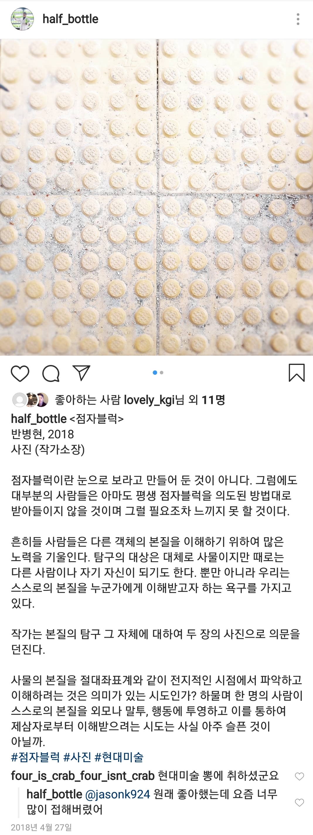 필자의 경우 이러한 감정은 대부분 일시적이고, 지극히 개인적인 것이므로 주변의 공감을 사는 것이 쉽지 않은 일이다. "이러한 감수성을 혼자서 간직하는 것이 아니라, 용기를 내어 타인에게 전달하고자 하는 사람"을 예술가라고 부르는 것이 아닐까. 무슨 학위가 있거나, 어느 대회에 입상했거나 하는 것은 전혀 중요하지 않다고 생각한다. 예술가에 대한 정의가 이리도 너그럽다 보니 자연스레 예술에 대한 정의 또한 경계가 모호하고 넓을 수밖에 없다.