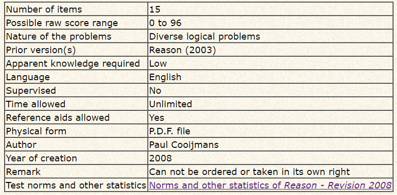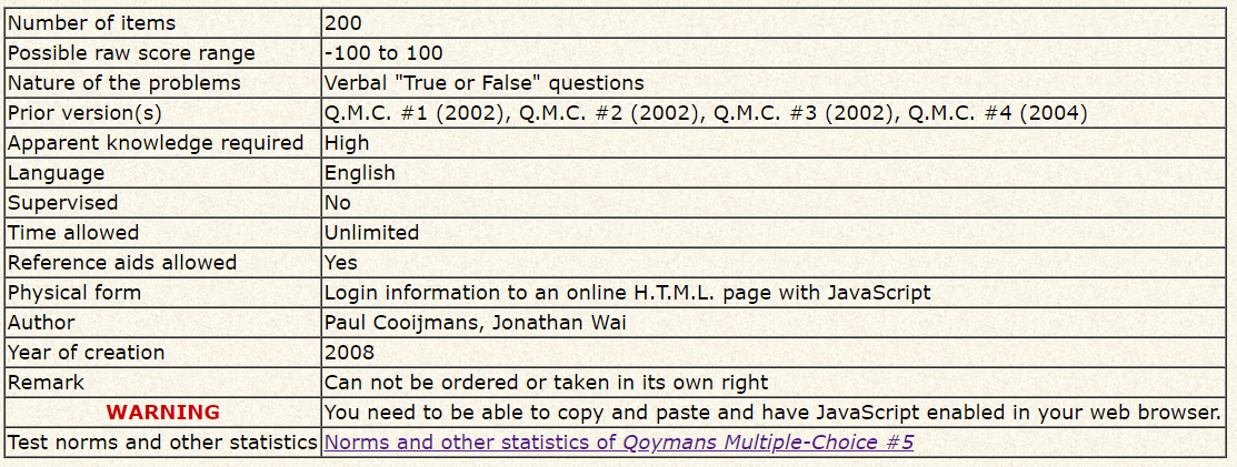 Paul Coojimans 테스트의 일종이다. 이 테스트는 Reason 이라는 검사와 Qoymans Multiple-choice 라는 검사를 섞어놓은 검사다.