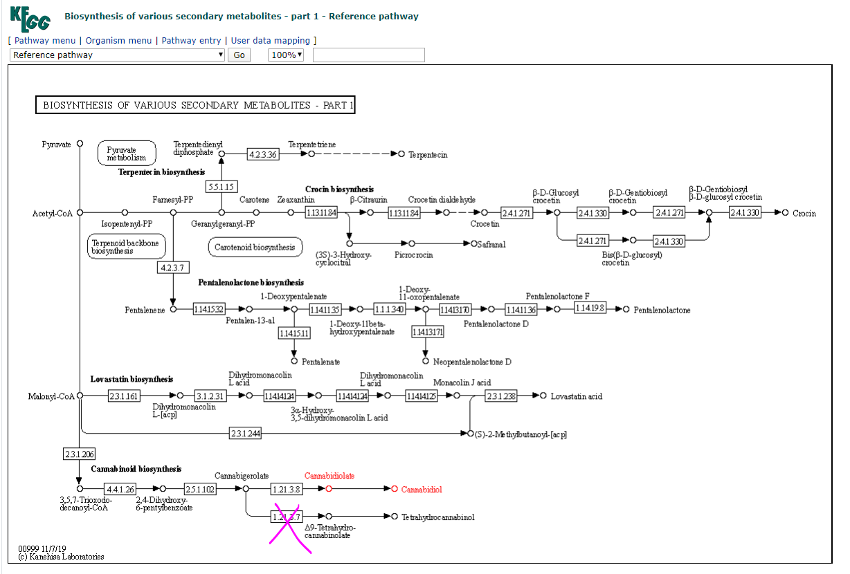 이게 무슨 의미냐 하면, 마약효과는 거의 없다시피한 의료용 대마를 만들 수 있다는 이야기이도 하다. KEGG Pathway로 가 보자.