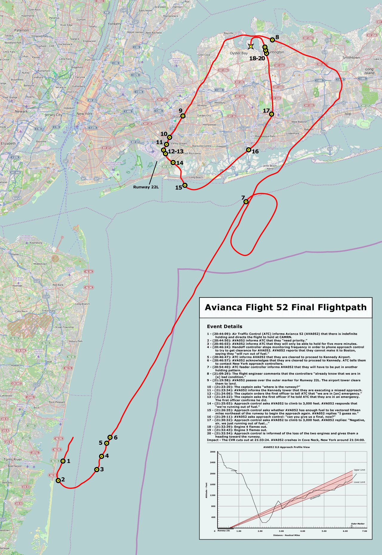 당시 존F 케네디 국제공항은 날씨가 좋지 않았다. 공항도 혼잡하고. 그래서 아비앙카 52편의 착륙이 지연되었다. 덕분에 아비앙카 52편은 뉴욕에 도착해 놓고서도 착륙을 하지 못 하고 1시간 넘게 하늘에서 순번을 기다렸다.