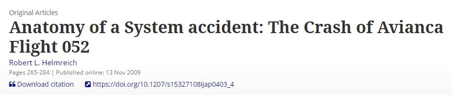 [3] Helmreich, R. L. (1994). Anatomy of a system accident: The crash of Avianca Flight 052. The international journal of aviation psychology, 4(3), 265-284.