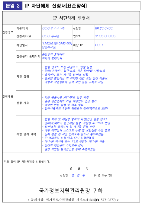 IP 차단 해제 신청 방법을 문자메시지로 전달받고 신청서를 받아보았다. 척 보기에도 공익 따위에게는 신청권한이 없어 보이는 서류였다. 어쩔 수 있나. 방금 전에 자동화 프로그램을 전달받고 신이 나 있던 담당공무원에게 자초지종을 설명하고, 혼나고 왔다.