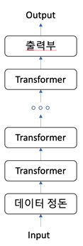 이 그림은 GPT의 구조를 표현한 것입니다. 입력값을 정돈하는 도구 뒤에 무수히 많은 Transformer를 이어붙입니다. 그리고 맨 뒤에 출력부를 부착하는 것이 GPT의 구조입니다. 단, Transformer 하나하나의 크기도 굉장히 크게 설계하고 그 개수 또한 말도 안 되게 많이 이어붙인 것입니다. 단, 여기서 사용된 Transformer는 인코더가 생략되는 등 구글이 발표한 원본과는 조금은 다른 구조를 가집니다.
