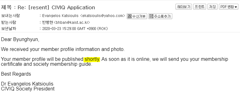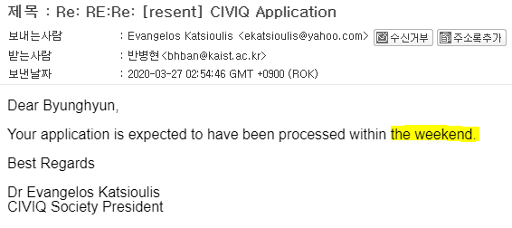 하나 또 의도치 않게 마음에 드는 점이 있는데, ISI 운영진이 사는 곳과 대한민국은 적당한 시차가 있다는 점이다. 퇴근 후에 이메일을 보내 놓으면 아침에 눈을 뜨자마자 답장을 확인할 수 있는 구조다. 오래 기다렸다는 느낌을 전혀 받지 않고 절차를 마무리할 수 있었다. 가입을 위해 이런저런 연락과 서류를 주고 받았는데 이를 요약하면 아래와 같다.
