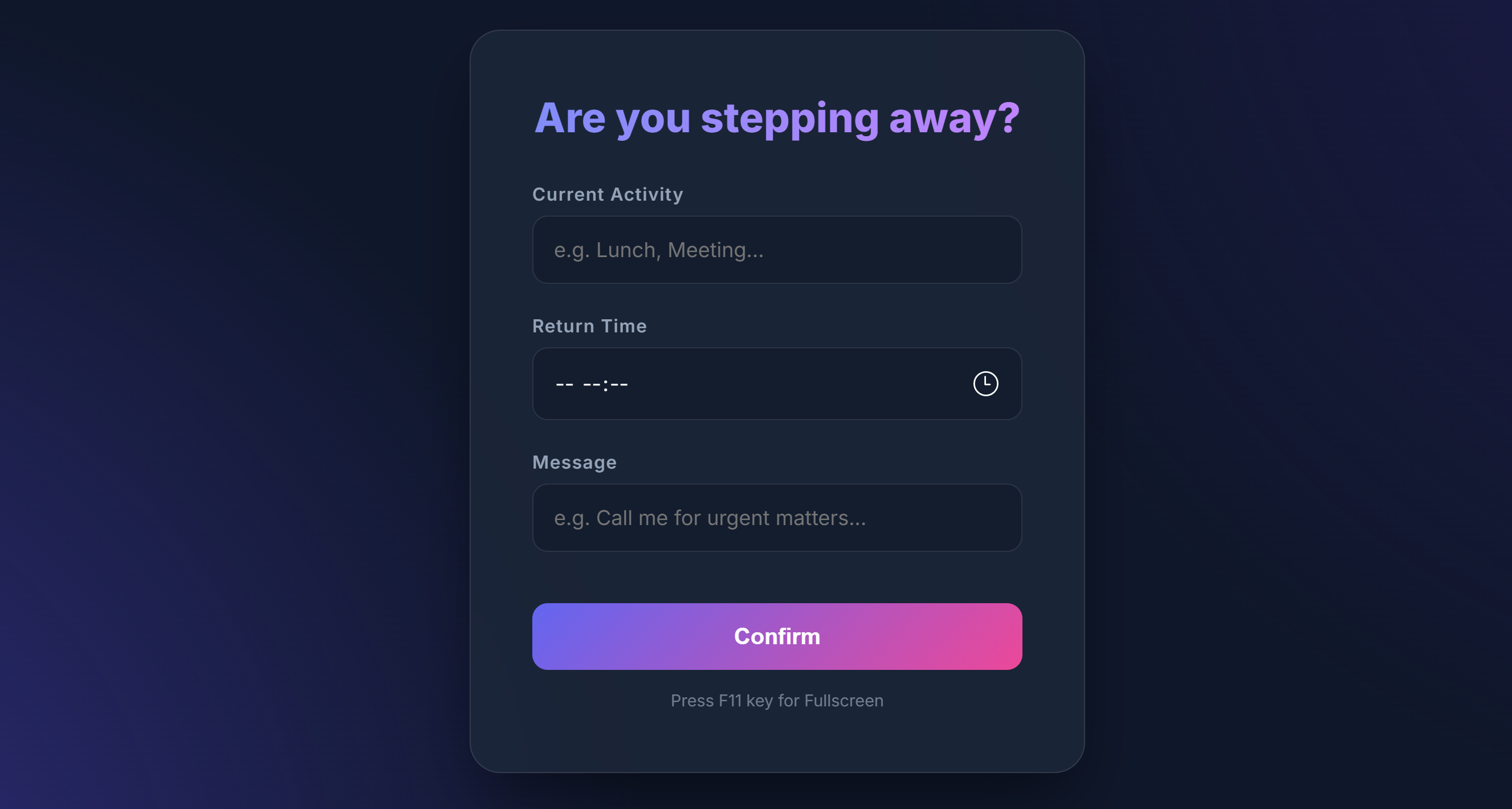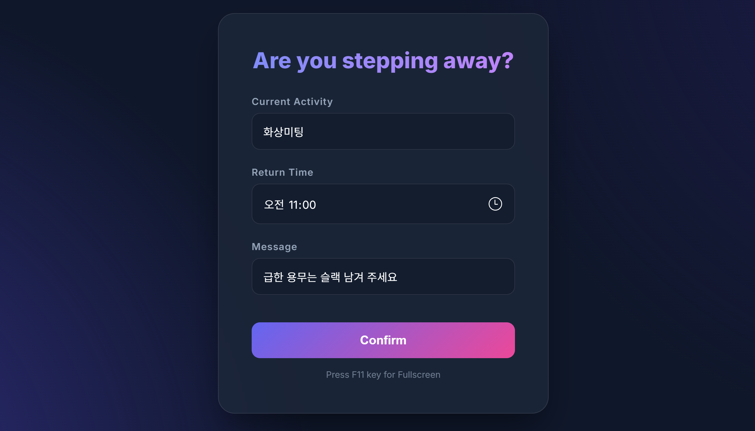 알람 시작시 자동으로 전체화면으로 확자장됩니다. 복귀 예정시간과 알림 메시지도 표시됩니다.