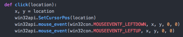 클릭은 간단하게 구현했다. 좌표를 튜플로 입력받고, 그 좌표에 "마우스 왼쪽 버튼 누름", "마우스 왼쪽 버튼 뗌" 이벤트를 각각 발생시킨다.