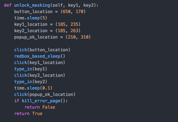 마스킹 해제 버튼이 화면상에 위치하는 좌표를 button_location이라는 튜플로 지정했다. key1_location과 key2_location은 각각 발신인과 수신인의 마스킹 키를 입력하는 입력 칸의 좌표이며 popup_ok_location은 팝업창의 '확인'버튼의 좌표다. 흐름은 굉장히 간단하다.