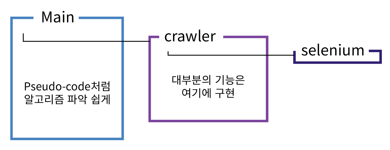 crawler라는 이름의 클래스를 만들고, 대부분의 기능을 이 클래스의 메서드로 구현했다.