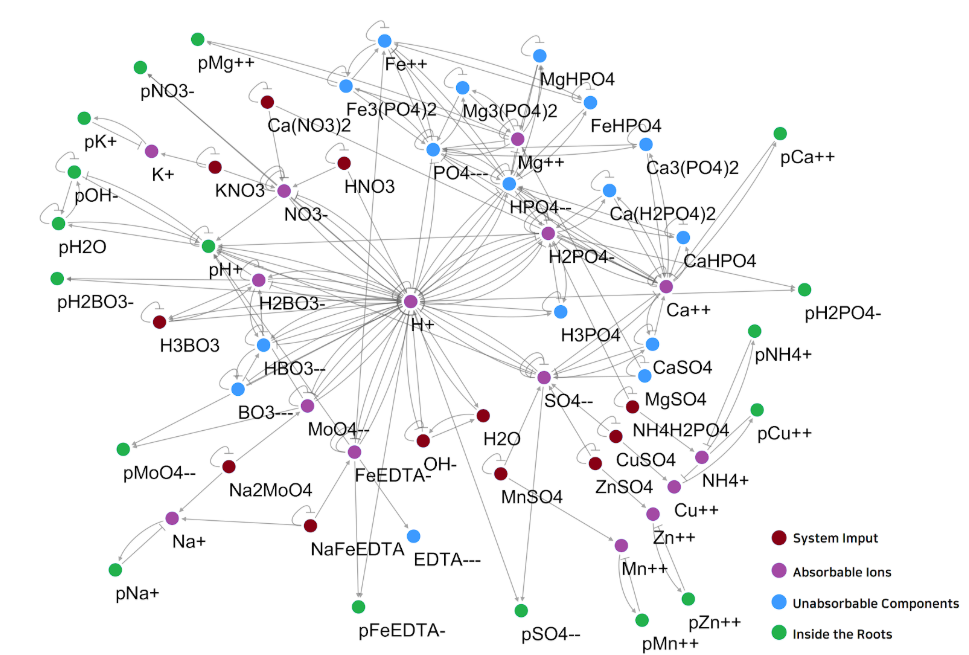 위 그림은 양액계를 표현한 것이다. 양액은 식물에게 영양분을 공급하기 위한 일종의 액체 형태의 비료다. 기술적으로 관측 가능한 이온은 총 4종류. 여기에 pH(산도)와 농도(EC)까지 총 6개의 변수를 관측할 수 있다. 사실상 대부분의 변수를 관측할 수 없는, 아주 훌륭한 블랙박스 시스템인 것이다. 마찬가지로 위 시스템 또한 완벽한 복잡계다. 그런데 이 정도면 양반이다. 양액과 식물이 상호작용하는 복잡계를 표현하면 아래 도식이 탄생한다.
