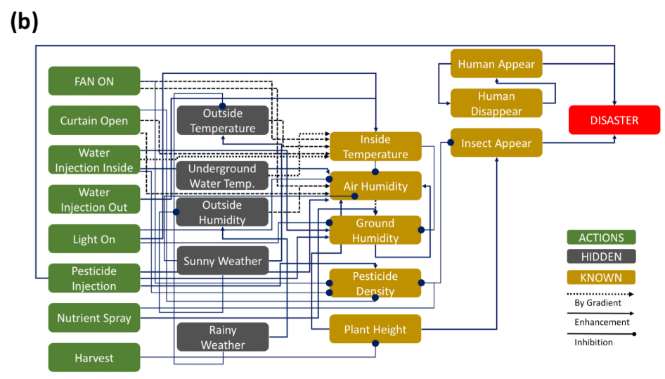 그런 자동화를 달성하려면 필연적으로 판단과 예측의 자동화가 달성되어야 한다. 또한 농업 뿐 아니라 제어공학 쪽 도메인지식 또한 필요하다. 이를테면 농업 시설을 비선형 블랙박스 복잡계로 바라보면 아래와 같은 도식을 그릴 수 있다.