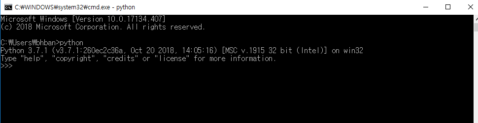 시작 + R키를 누르고 cmd를 입력한다. 그리고 엔터키를 누른다. 그러면 까만 창이 하나 뜰 것이다. 여기에 python을 입력하고 엔터를 쳐 보자.