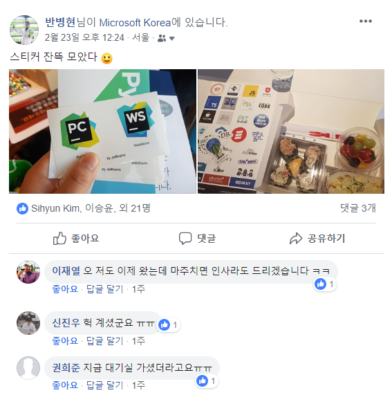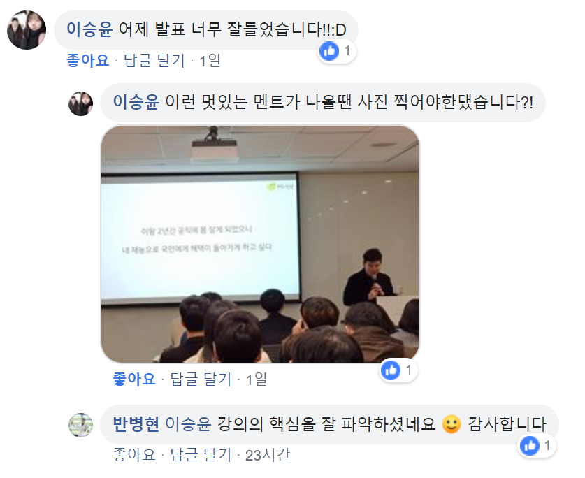 이 행사장에는 필자 말고 또 다른 코딩하는 공익도 와 계셨다. 변준석 님도 근무지에서 코딩으로 업무를 혁신하고 계시는 분이시다. 랜선 인맥이었는데 덕분에 실제로 만나 뵙고 인사를 나눌 수 있었다. 잠시 대화를 나누다 보니 이재열 님이 정말로 인사를 주시고 쓱 지나가셨다. 모두 오늘 처음 뵙는 분이다. SNS가 이렇게 위대하다.