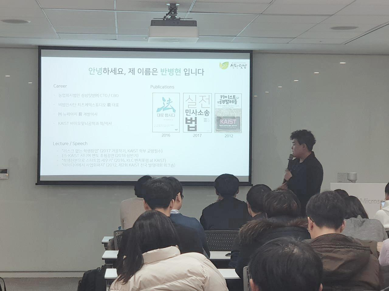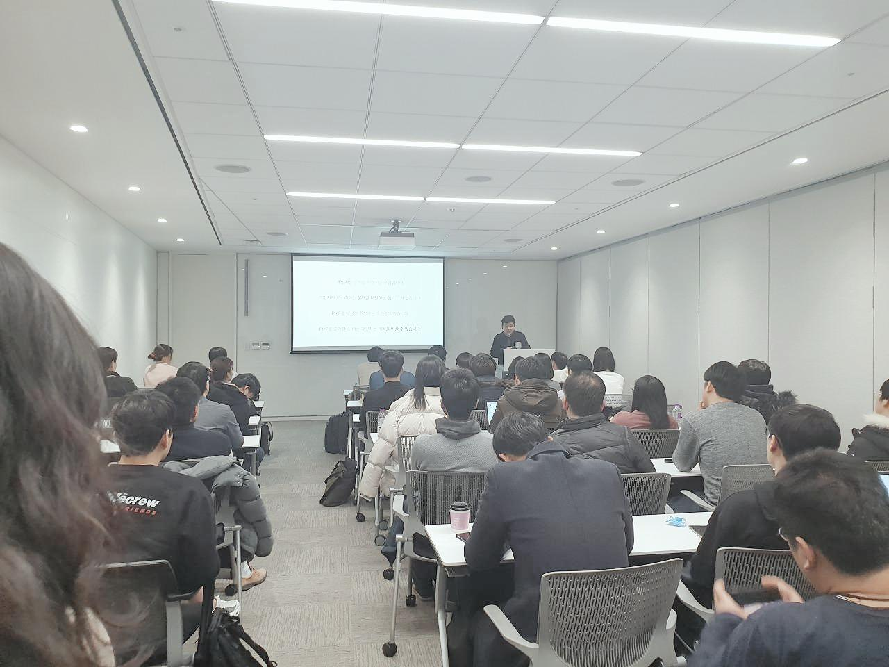 생각보다 사람들이 많이 들어온다 싶었는데 끝이 없이 들어왔다. 정말로 당황했다. 생각이랑 너무 다른데? 당황하니 갑자기 출타했던 긴장감이 귀가했다. 떨리는 손으로 노트북을 프로젝터에 연결하는 사이 코딩이랑무관합니다만 윤성국님이 필자를 소개해 주셨다.