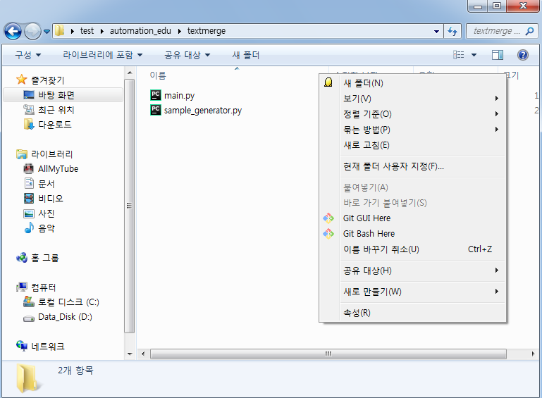 기존에 떠 있던 git bash 창은 닫아주자. 이후 textmerge 폴더에서 마우스 우클릭을 해서 git bash here를 눌러 준다. 그리고 아래 명령어를 입력한다.