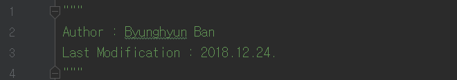 1번 줄부터 4번 줄까지는 이 코드에 대한 정보를 기술한다. 필자의 경우 코드를 작성한 사람의 이름과 최근 수정 날짜를 기재하였다. 필요하다면 여기에 작성자의 이메일이나 연락처를 기재할 수도 있을 것이다. 이 부분은 녹색 글자로 되어 있다. 굳이 삽입할 필요는 없는 부분이긴 하다.