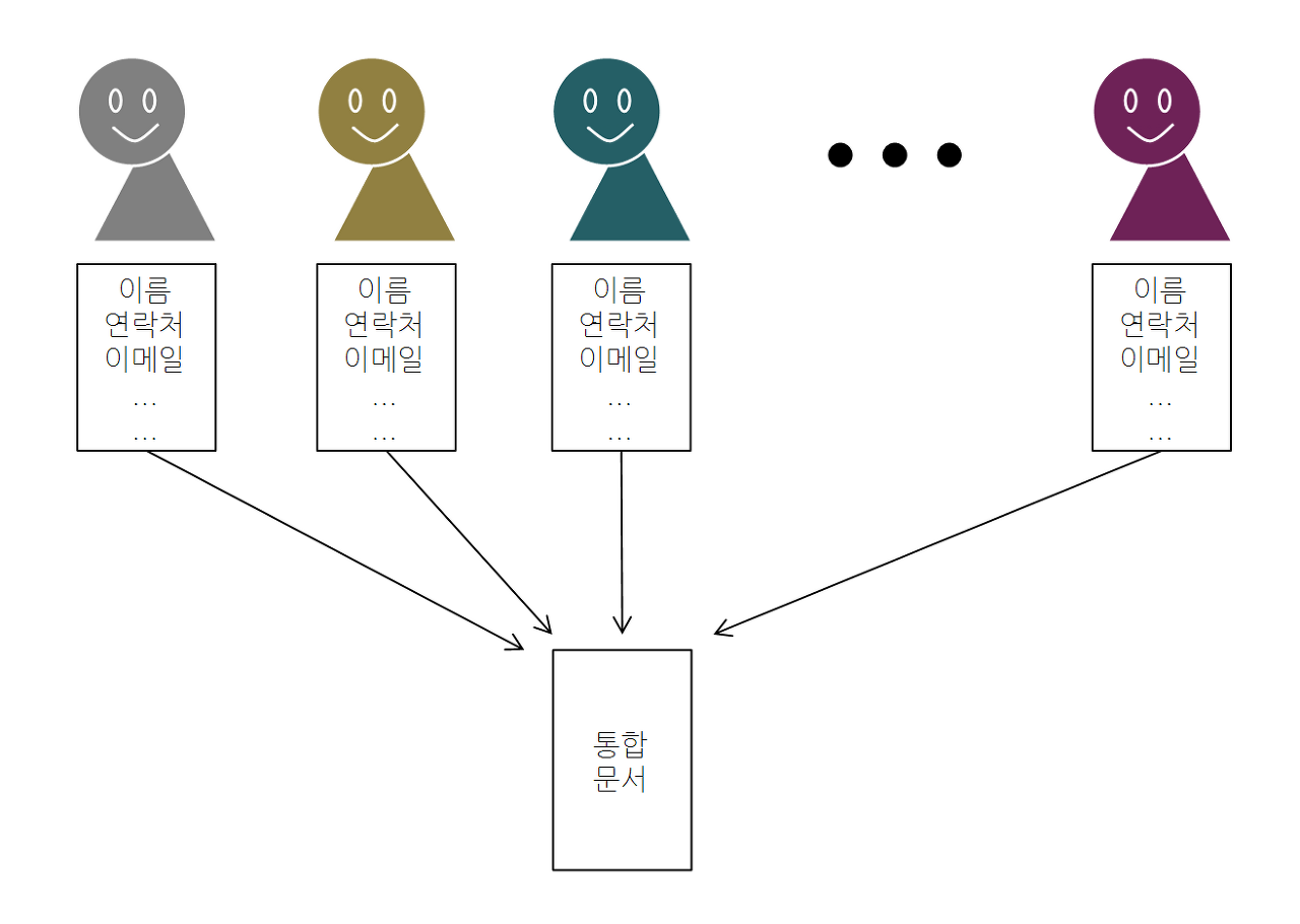 이번 강좌에서는 여러 개의 파일을 하나로 합치는 과정을 어떻게 자동화할 수 있는지 실습해 보도록 하겠다. 위 그림과 같은 상황이라 생각하면 되겠다. 총 n명의 사람이 각각 작성해 제출한 개인정보를 하나의 파일로 통합하는 과제이다.