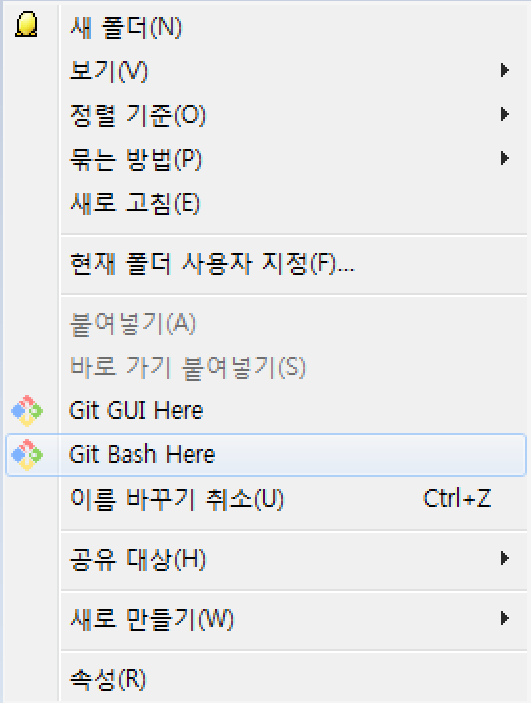 지난 강좌를 잘 따라왔다면, 오른쪽 마우스를 클릭하면 Git Bash Here라는 메뉴가 생겨 있을 것이다. 이것을 클릭하자.