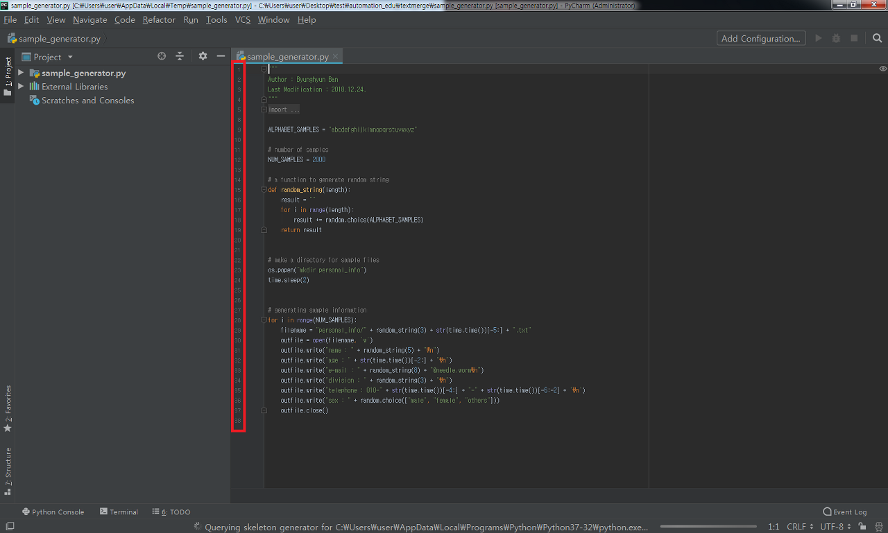 sample_generator.py를 더블클릭해보자. 우리가 지난번에 설치만 하고 꺼버렸던 pycharm이라는 소프트웨어가 실행될 것이다. 언제 봐도 아름답고 멋진 화면이다.