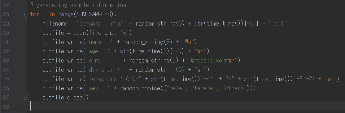 혹시 폴더의 내용물이 2천 건이 되지 않는다면 personal_info 폴더를 삭제하고, sample_generator.py 대신 sample_generator_while.py를 실행하자.