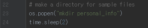 23번 줄은 아까 import 한 os모듈을 사용한다. 여기서는 'personal_info'라는 이름의 폴더를 생성하라는 명령어를 윈도에게 전달한다.