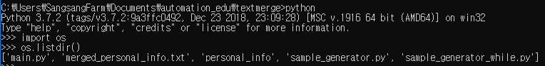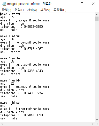 personal_info 폴더 내에 다른 텍스트 파일을 넣어 둔다면 그 파일들도 하나로 합칠 수 있다. 다른 폴더 안의 내용물을 합치고 싶다면 코드 8번 줄의 directory를 수정해서 코드를 돌려 보자.