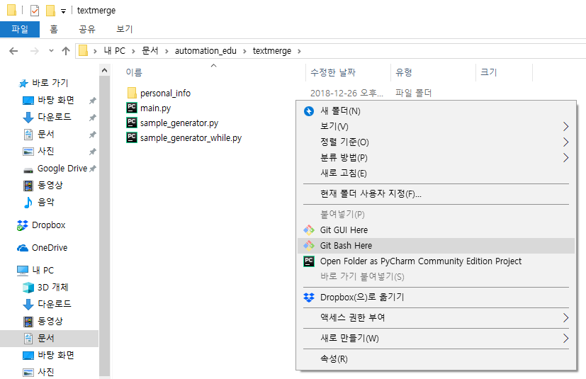 textmerge 폴더에서 마우스 우클릭을 하고, git bash here을 눌러 주자. 그리고 아래 명령어를 입력한다.