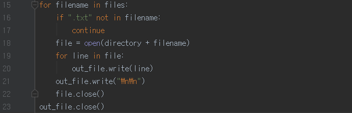 16번 줄에서는 filename을 검증한다. filename에 '.txt'라는 문자가 포함되어 있는지를 체크하는 것이다. 우리가 실수로 섞어 둔 다른 파일이나, 시스템에서 생성한 보이지 않는 이상한 파일들이 섞여 들어오는 문제를 미연에 방지하는 것이다. 이렇게 작업을 수행하는 과정에서 문제가 일어날 여지를 미리 차단하는 습관을 들이는 것이 중요하다. 상세한 것은 '파이썬 조건문'을 검색해 보자.