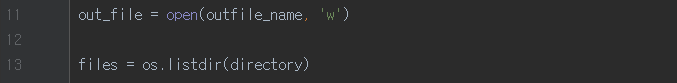 11번 줄에서는 open 함수를 이용해, outfile_name이라는 이름을 가진 파일을 쓰기 모드로 열었다. 지난번 강좌에서도 사용했던 것이므로 설명은 생략하겠다. 궁금하신 분들은 '파이썬 파일 입출력'이라고 구글에 검색하기 바란다.