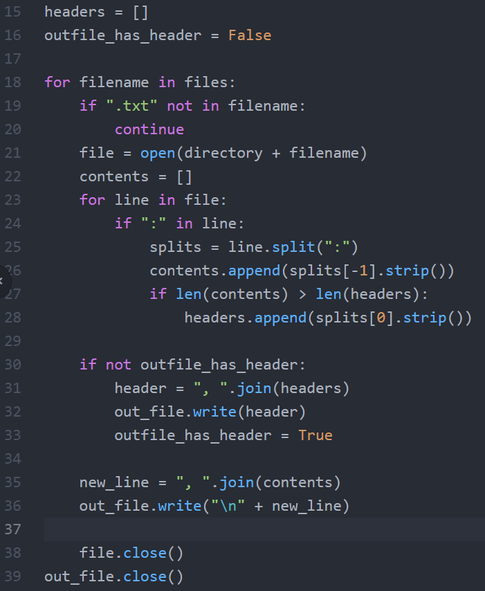 16번 줄에서는 outfile_has_header라는 변수를 선언하고 이 변수의 값을 false라고 뒀다. false는 거짓이라는 뜻이다. 여러분은 "파이썬 조건문"을 이미 예습하고 왔을 것이므로 상세한 설명은 생략하도록 하겠다. 지금부터 이어질 코드에서는 outfile_has_header가 false이면 out_file에 header를 삽입한다. 만약 outfile_has_header가 True일 경우에는 out_file에 header를 삽입하지 않고 넘어갈 것이다. '혹시 이 작업이 이미 수행된 적이 있나요?'라는 질문에 대한 대답을 따로 적어두는 것이다.