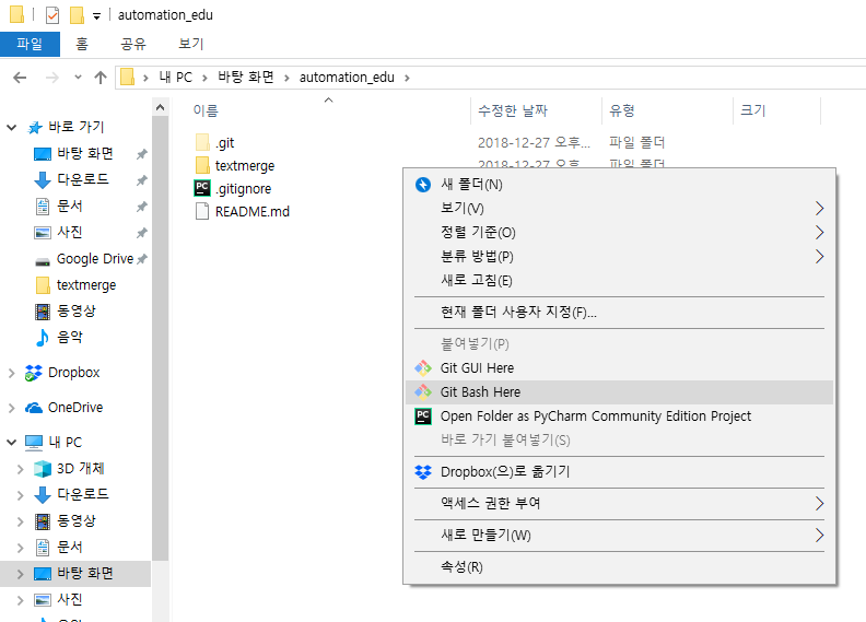 자, automation edu 폴더로 이동해 git bash를 켜 주자. 그리고 아래 명령어를 입력하자.