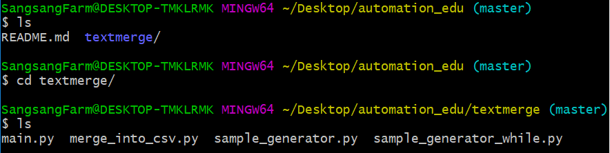 폴더 내부의 내용물을 모두 보여준다. 하얀색 글자는 파일, 파란색 글자는 폴더를 의미한다. 이제 textmerge/ 폴더로 이동해 보겠다. 아래 명령어를 입력하자.