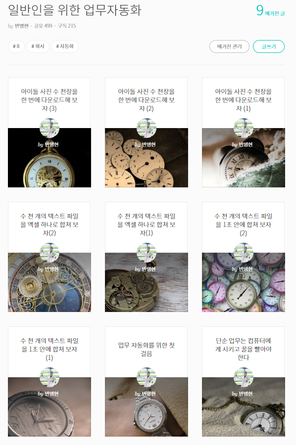 마음에 드는 사진이 나오면 그제서야 글을 쓸 수 있게 된다. 다른 글들과 달리 업무자동화 글은 코드와 작동 화면이 들어가 줘야 되기 때문에 준비과정이 길다. 사진자료들이 시간적 순서에 맞게 착착 들어가 주면 그 사이사이를 글로 메꾸는 작업만 하면 되는데, 이 과정에서는 필자가 크게 머리를 굴릴 여지가 많지 않은 것 같다. 아무래도 무언가를 설명하는 글이다 보니 재미요소를 녹여낼 구간이 부족한 것이다.