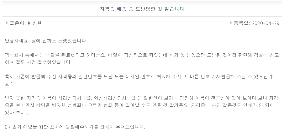 "자격증 발급처에 그 자격번호를 정지하고 재발급해달라고 요청하세요. 심리쪽 자격증이면 누가 그거 가지고 범죄 저지를 수도 있을 것 같거든요."