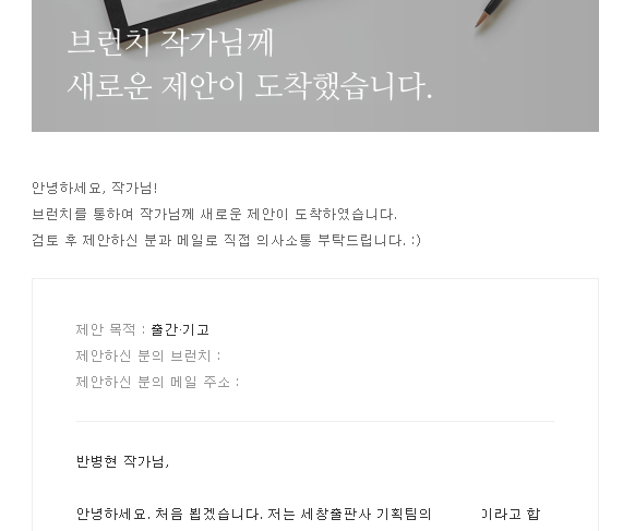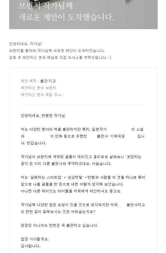 그리하여 브런치에 상품성 있는 글을 연재할 경우 출판사 관계자가 <제안하기> 버튼을 눌러 먼저 연락을 한다. 이게 가장 바람직한 첫 번째 경우다. 내가 받았던 제안 몇 개를 공개한다.