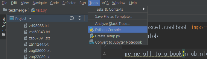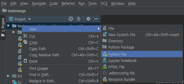 정상적으로 폴더가 실행되었다면 좌측에 목록이 뜰 것이다. 여기서 textmerge 폴더를 마우스 우클릭하고, new - python file을 선택해 준다. 그러면 새로운 파이썬 파일이 생성된다. 파일명은 적당히 지어주자.