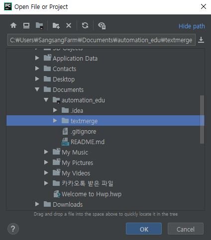 이때 automation_edu를 선택해 버리면 working directory가 automation_edu/로 잡히게 된다. 그러니 textmerge를 선택하고 ok를 눌러 주자. 사소한 차이가 있긴 한데 이로 인해 여러분들이 고생할 수 있다. ok를 누르면, 경우에 따라 현재 창에서 실행할 것인지 새로운 탭에서 실행할 것인지 물어보는 창이 뜰 수도 있다. 취향에 따라 선택하자. 필자는 노빠꾸 상남자이므로 무조건 현재 창에서 실행한다.