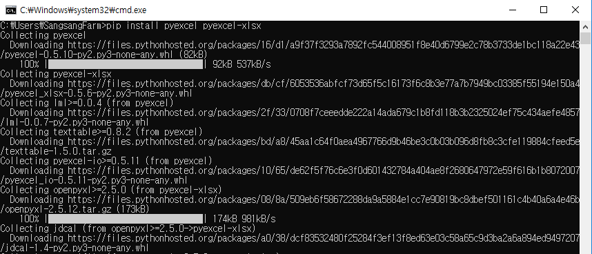 pip은 파이썬을 위한 패키지를 관리해 주는 툴이다. install은 설치를 하라는 의미이다. 즉 위 명령어는 pyexcel과 pyexcel-xlsx라는 패키지를 컴퓨터에 설치하라는 의미다. 더 자세한 사항은 구글에 "파이썬 pip"이라고 검색해 보기 바란다. 참고로 필자는 PIP을 만드신 분과 사진도 찍었고, 같이 밥도 먹었다.