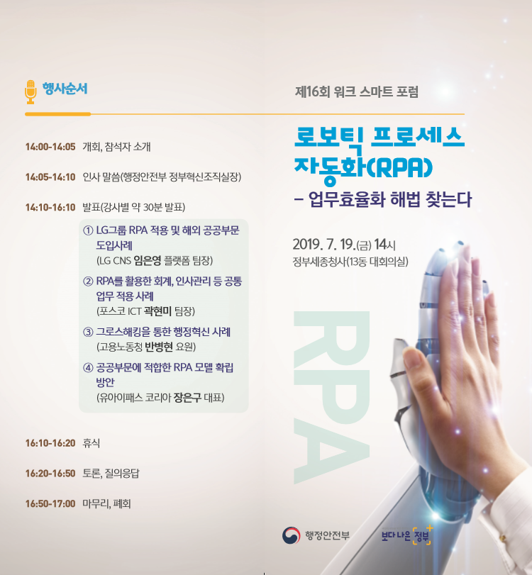 "원래 워크스마트 포럼이 기업들 불러다가 사회에서 어떤 일이 일어나는지 정도만 공무원들이 알아가는 자리거든요. 그런데 이번에는 행안부 내부에 RPA(업무 자동화)를 실제로 도입해 보자고 이야기가 나왔습니다."