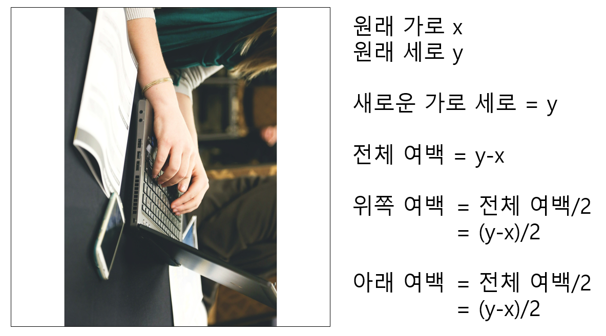 비슷한 논리로 세로로 긴 이미지의 좌우 여백은 (y-x)/2가 된다. 어떤가, 뺄셈과 나눗셈 밖에 없었다. 정말로 초등학생도 할 수 있는 계산이다.