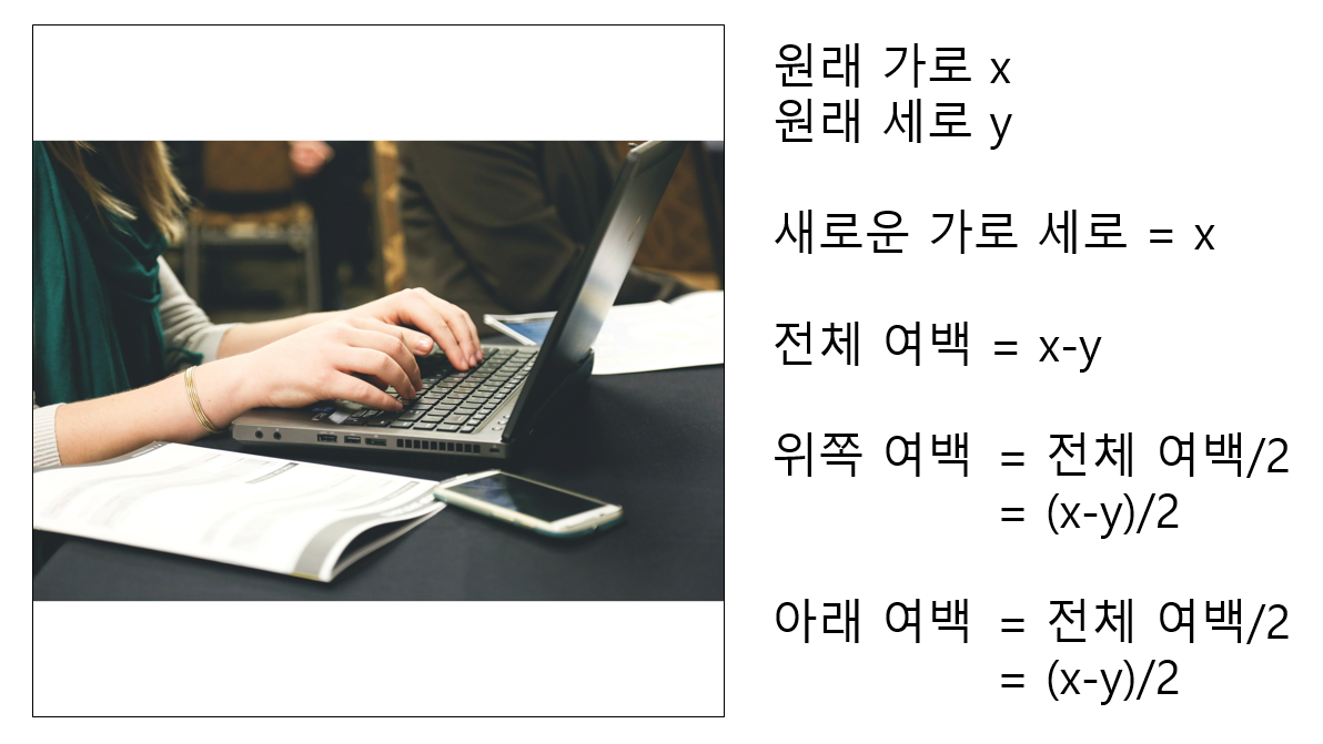 가로로 긴 이미지를 정사각형으로 변환할 경우 아래위에 흰색 여백을 삽입해야 한다. 이 여백의 높이는 위와 같은 간단한 수식으로 계산할 수 있다. 새로운 가로 세로 길이는 모두 조금 더 긴 축인 x로 고정된다. 그러면 전체 여백은 새로운 길이 x에서 원본 이미지 높이를 뺀 x-y 만큼이 된다. 아래위 여백은 전체 여백의 절반에 해당한다. 이 값은 (x-y)/2가 된다.