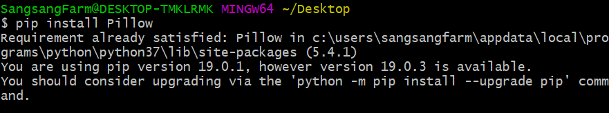 필자의 컴퓨터에는 이미 Pillow가 설치되어 있기 때문에 관련된 메시지가 나왔다. Pillow가 설치되지 않은 컴퓨터라면 설치 과정이 표기될 것이다. Pillow가 설치되었다면 이제 준비과정은 끝났다.