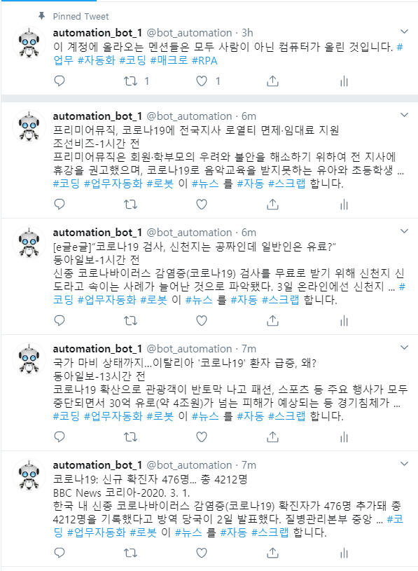 본 매크로로 자동으로 글을 올리는 트위터 계정이다. 아래 스크린샷처럼 작동한다.